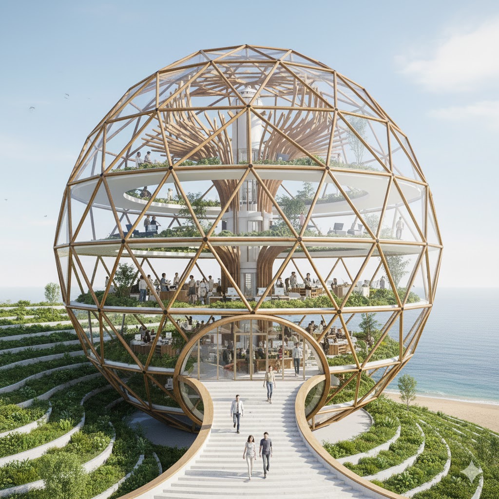 Der Nexus der Klänge ist ein bahnbrechendes Zentrum für Musik, Kreativität und Lehre, das als architektonische Kugel elegant an der Küste thront. Das Projekt verkörpert die Symbiose von zukunftsweisendem Design und radikaler Nachhaltigkeit und ist die europäische Heimat für die Förderung und Aufführung zeitgenössischer Klangkunst.
