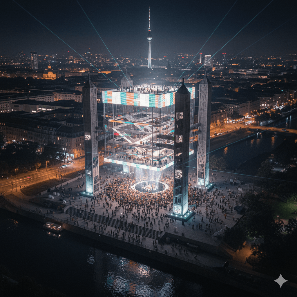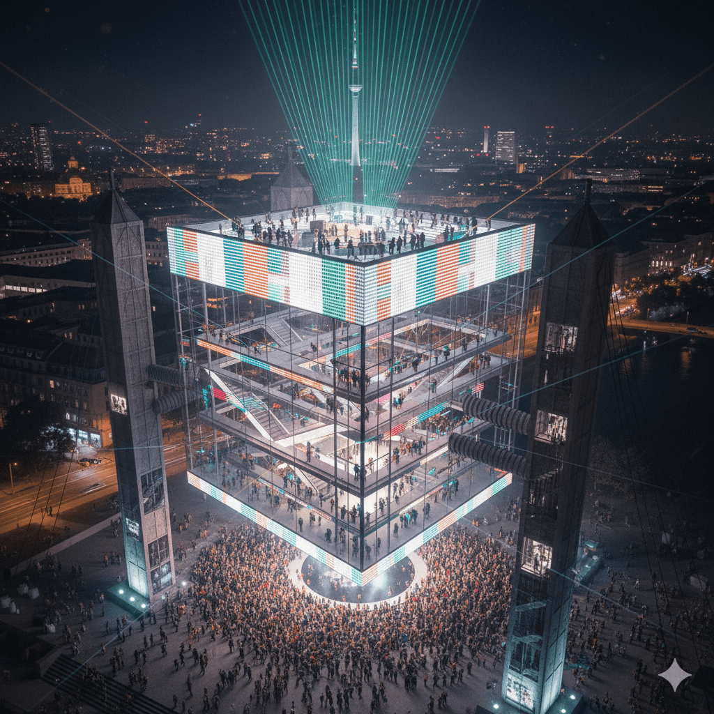 Dieses Projekt entwirft ein visionäres Veranstaltungsgebäude für zeitgenössische Musik, das klassische Symmetrie mit futuristischer Leichtigkeit verbindet. Der Bau ist inspiriert von Andrea Palladios Villa Rotonda – einem Meisterwerk der Renaissance, das durch seine zentrale Raumkomposition, vier gleichwertige Fassaden und harmonische Proportionen weltberühmt wurde. Diese Prinzipien werden hier in eine radikal zeitgenössische Form übersetzt: als schwebender Kubus über Berlin.