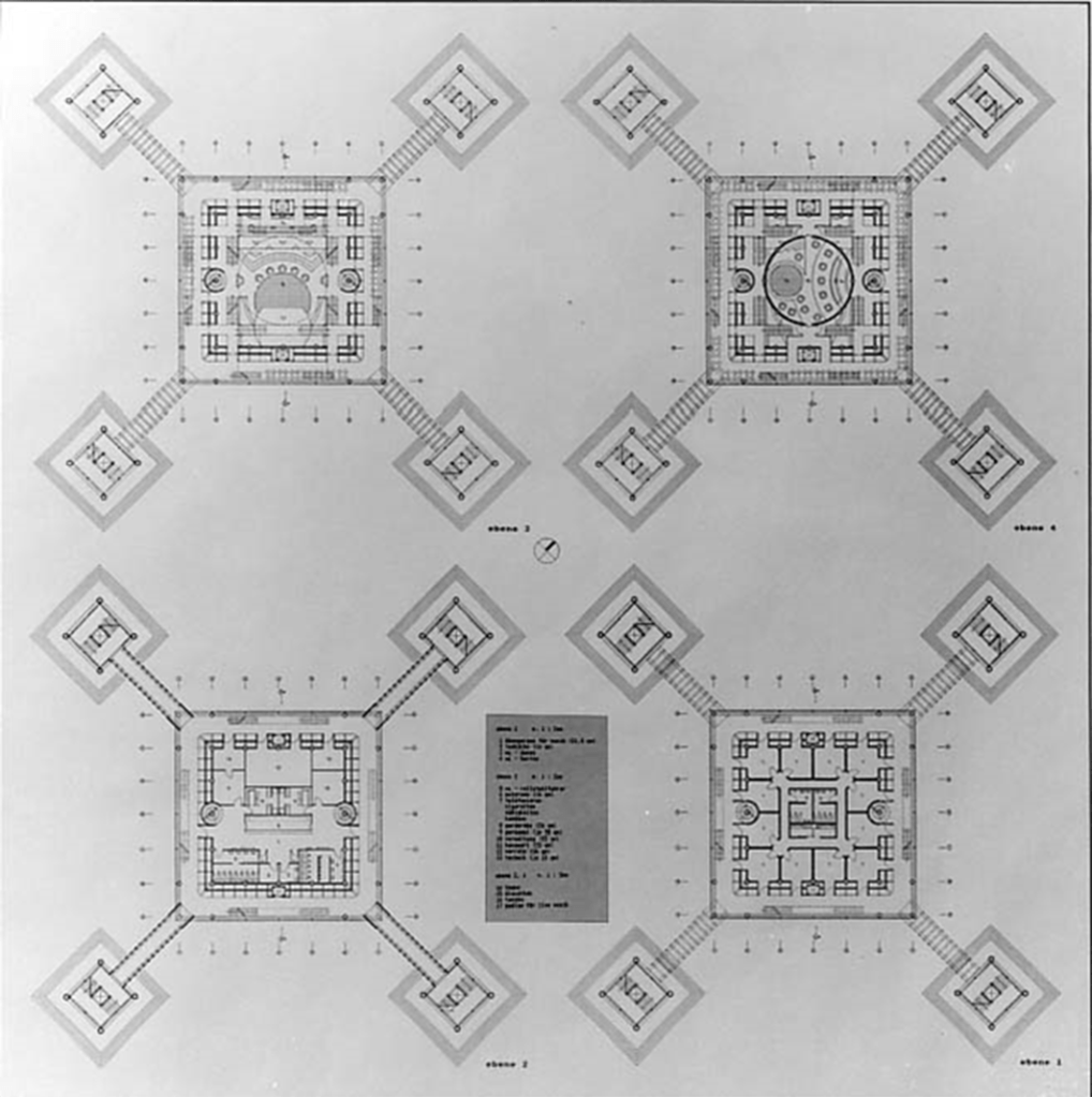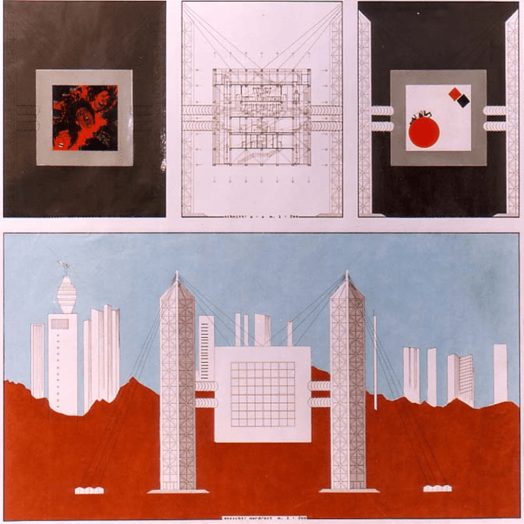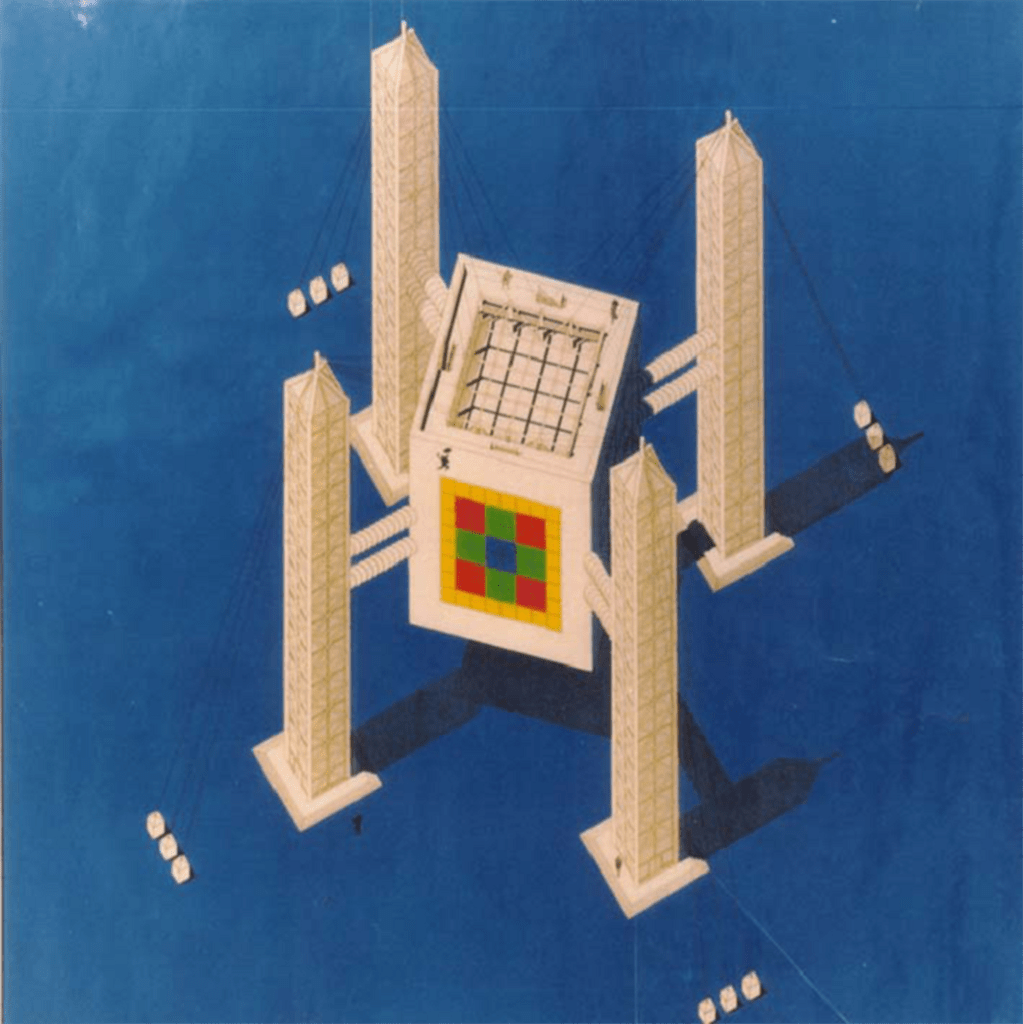 Der Baukörper – ein geometrisch präziser Würfel – hängt frei zwischen vier monumentalen Säulen, die ihn mittels Seilspannungen tragen. Die Säulen sind nicht nur statische Träger, sondern zugleich als begehbare Eingangsachsen konzipiert. Sie verankern das Gebäude im Stadtraum und schaffen eine klare Orientierung in alle vier Himmelsrichtungen – ganz im Sinne Palladios.