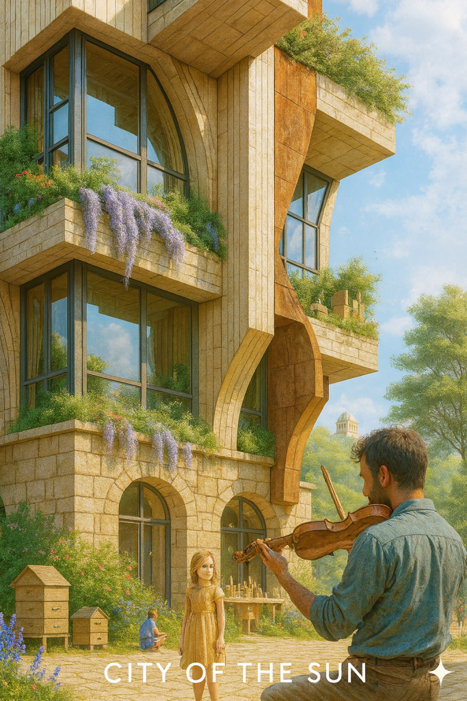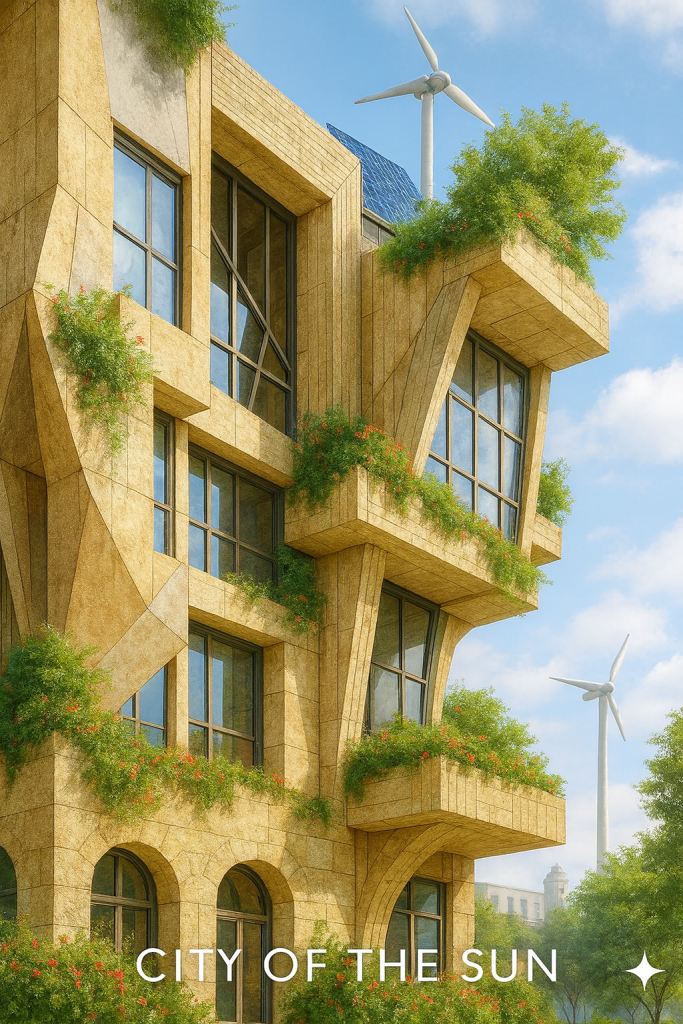 Die Balkone und Terrassen sind unregelmäßig angeordnet, manche ragen weit hinaus, andere ducken sich unter schrägen Dachvorsprüngen. Auf dem Dach selbst: Solarpaneele in geometrischen Mustern, Windturbinen, die sich lautlos drehen, und eine Plattform für Meditation – mit Blick auf die Stadt und den Himmel.