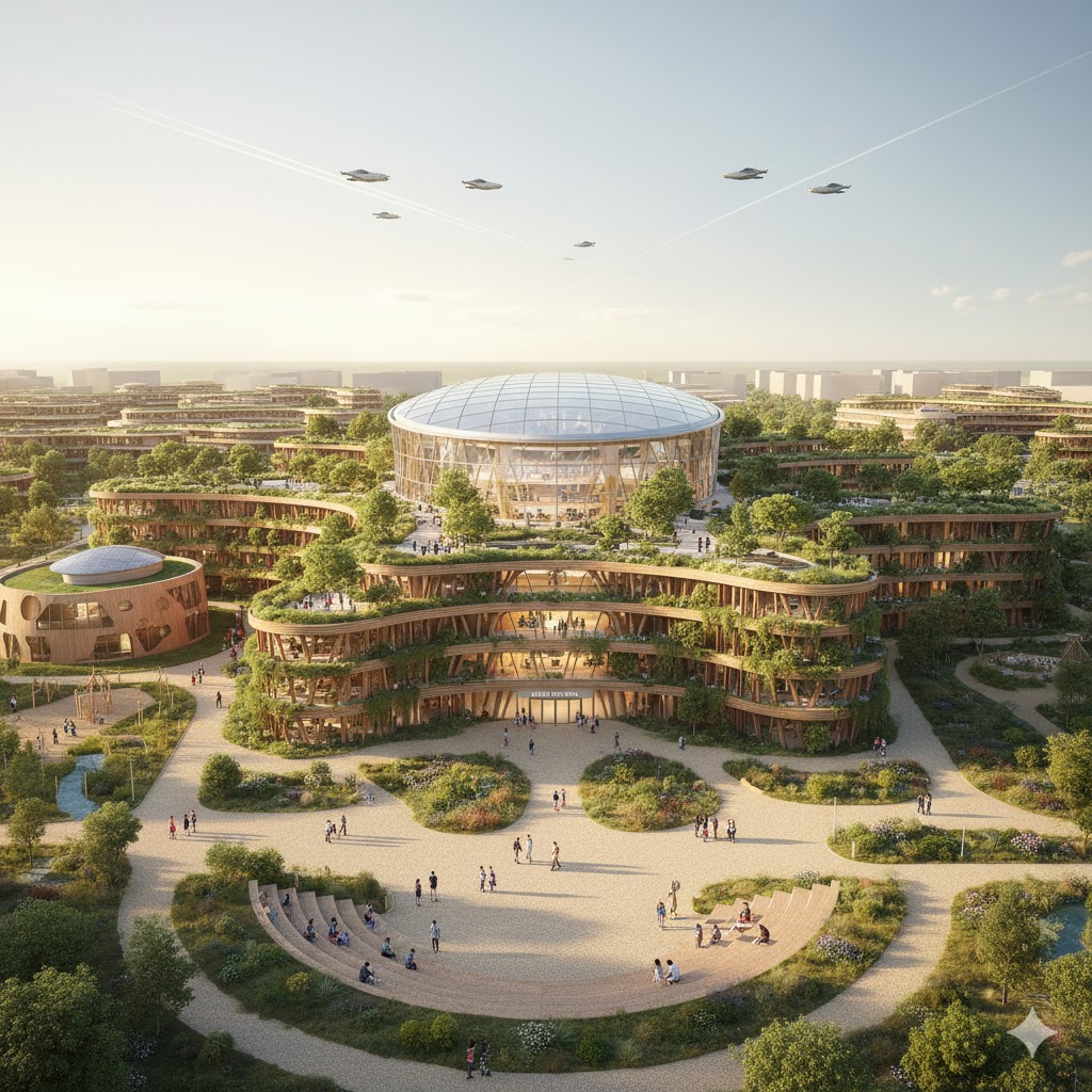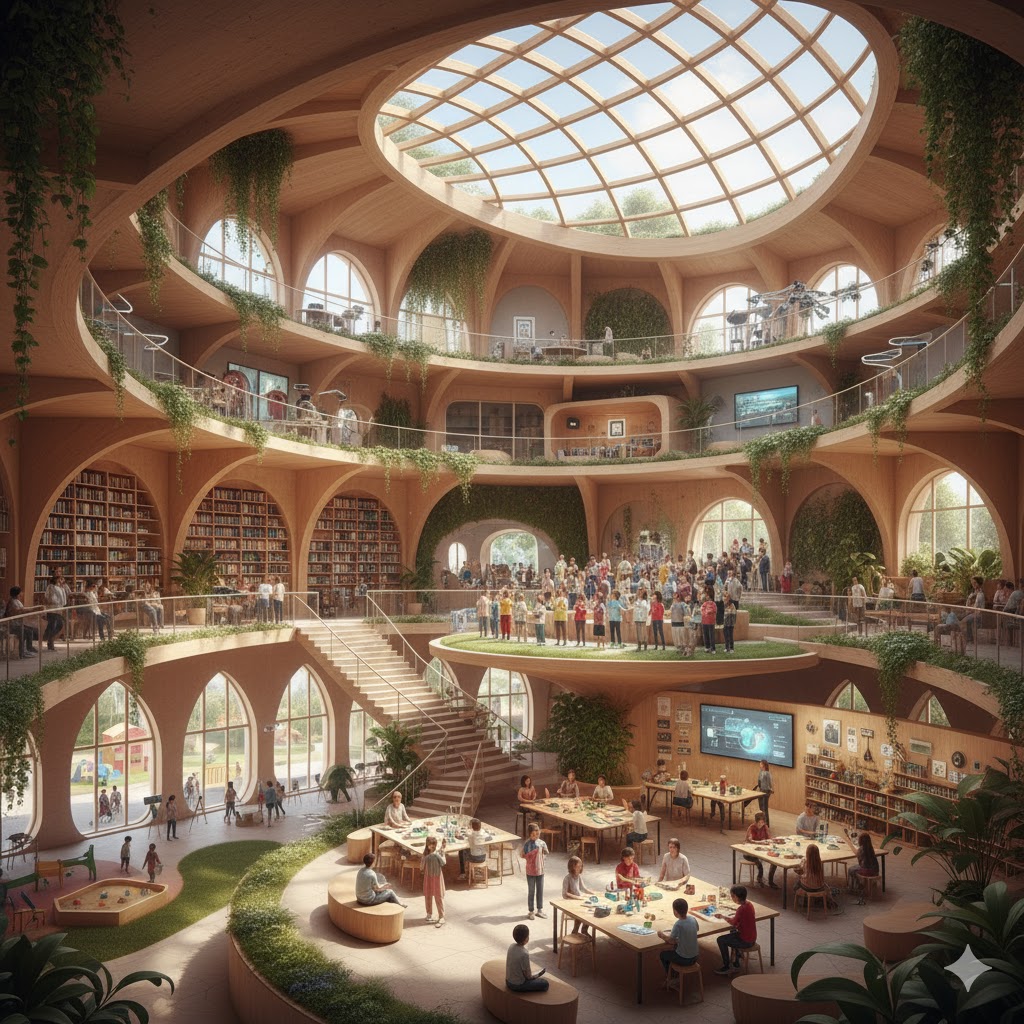 Die Gemeinschaftsschule “Haus der Stimmen” ist ein futuristisches, atmendes System, konzipiert für ca. 1000 Schülerinnen und Schüler (Kita bis Abitur, Klasse 1-13). Die Architektur selbst ist ein drittes pädagogisches Element neben Lehrern und Schülern. Sie bricht starre Strukturen auf und schafft ein vielschichtiges, inklusives Lernquartier, das Würde, Gemeinschaft und individuelle Begabung in den Mittelpunkt stellt.