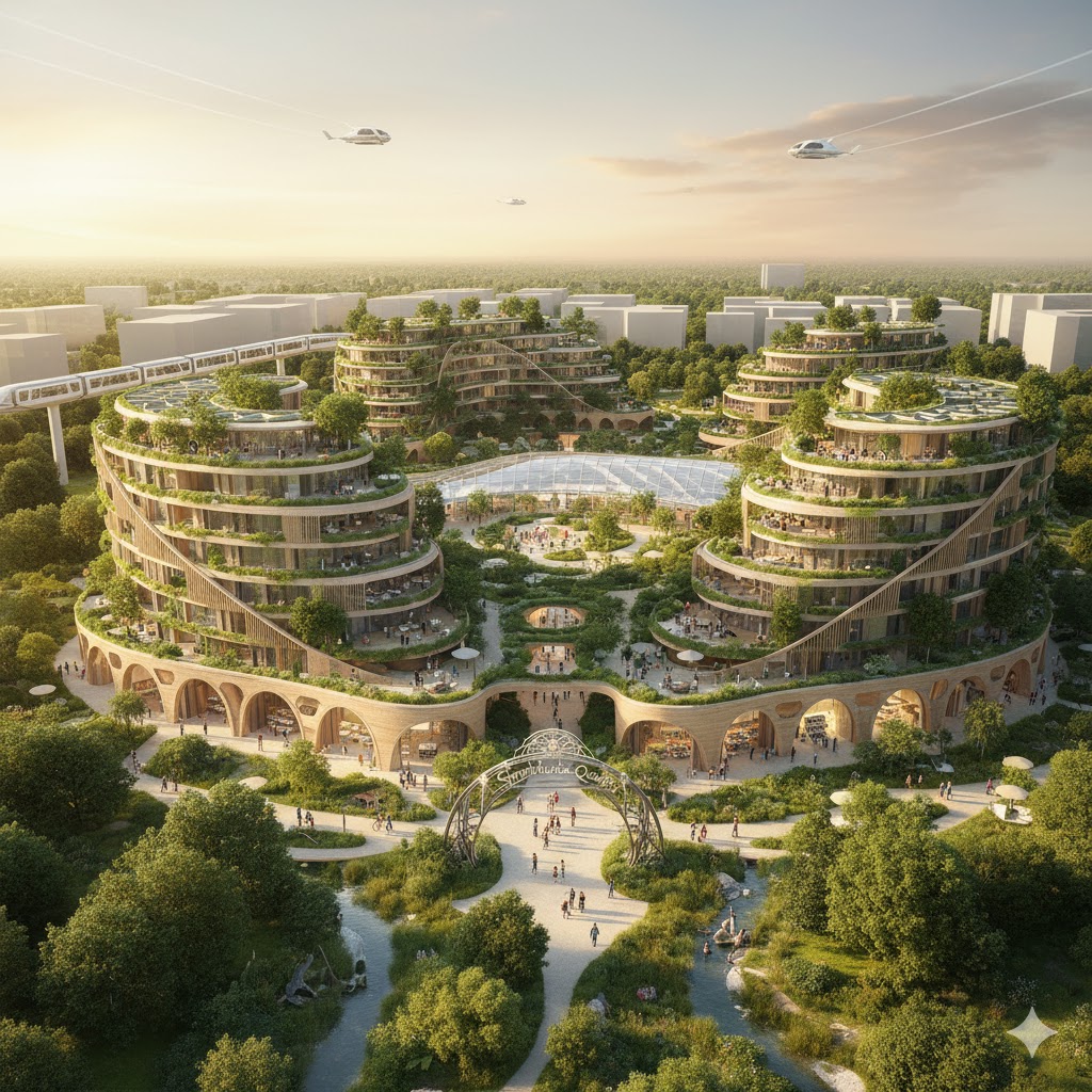Die City of the Sun repräsentiert eine radikale Abkehr vom überholten Paradigma der funktionalen Trennung urbaner Räume. Sie ist die Antwort auf die Erkenntnis, dass die konventionelle Stadtplanung – mit ihrem rigiden Zentrum für Arbeit, der Peripherie für Wohnen und separaten Zonen für Erholung – nicht nur ineffizient und energieintensiv ist, sondern auch das menschliche Wohlbefinden und die Verbindung zur Natur fragmentiert. In der City of the Sun verschmelzen Arbeiten, Wohnen und Erholen zu einem kontinuierlichen, fließenden Erlebnis, das an jedem Punkt der Stadt präsent ist.